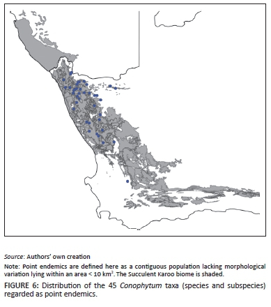 The incidence of point endemism in the genus is very high, and approximately one fifth of all taxa can be categorised as such (Table 3). The majority of these point endemics (defined here as a contiguous population lacking morphological variation lying within an area of < 10 km2; though areas are typically much smaller) are found in the Succulent Karoo biome (Figure 6). These are severely range-restricted taxa and the area of occupancy for such point endemics can be as small as approximately 1000 m2 - 2000 m2 (e.g. in the case of Conophytum jarmilae and Conophytum burgeri).