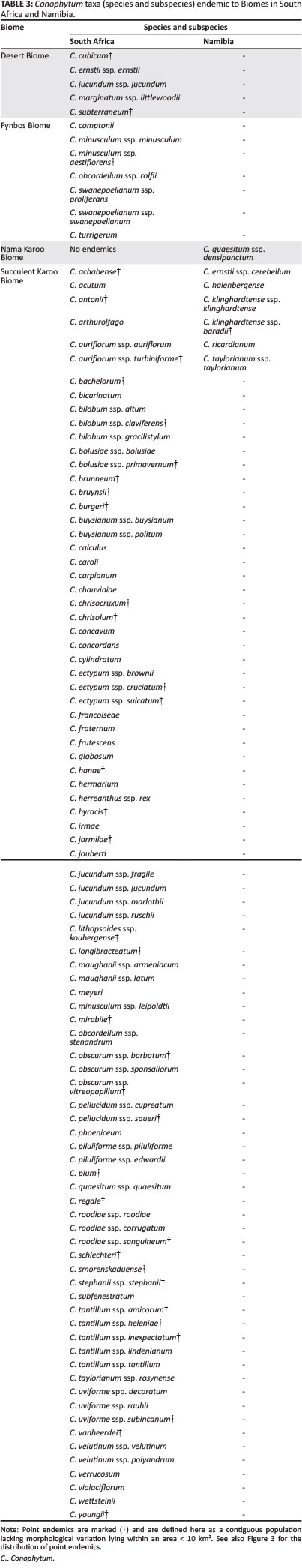 RESULTS: The genus is primarily restricted to the arid winter-rainfall region of the Northern and Western Cape Provinces of South Africa and south-western Namibia, within the Greater Cape Floristic Region. Whilst taxa are found across all the main biomes in the region (the Succulent Karoo, Nama Karoo, Desert and Fynbos biomes), 94% of Conophytum taxa are found only in the Succulent Karoo biome and predominantly (88% of taxa) within South Africa. Endemism within specific bioregions is a feature of the genus and ~60% of taxa are endemic to the Succulent Karoo. Approximately 28% of all taxa could be considered point endemics. Whilst the genus has a relatively wide geographical range, we identify a pronounced centre of endemism in the southern Richtersveld.
