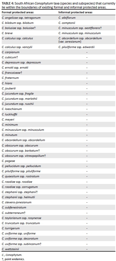 The conservation status of members of the genus has been examined for formal and informal protected areas, as well as focus areas identified by the South African National Protected Areas Expansion Strategy (NPAES). Currently, 47 taxa (including 36 species) lie within formal protected areas, representing ~30% of the genus (Table 4). In addition, a further six taxa are found within informal protected areas, of which three are not already protected. When combined, such areas in South Africa provide protection for 50 separate Conophytum species and subspecies. The NPAES focus areas have the potential to extend protection to a further 76 taxa and provide additional area for 30 protected taxa. Within Namibia, all endemic Conophytum taxa, with the exception of C. quaesitum ssp. densipunctum, can be found within or are restricted to existing protected areas, namely the Sperrgebiet National Park and the Ai-Ais Richtersveld Transfrontier National Park.