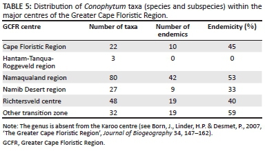 Mapping the distribution of the genus onto the centres of the Greater Cape Floristic Region (as defined by Born, Linder & Desmet 2007) provides a further interpretation of the distribution of the genus and its relationship to other floras (Table 5). Because of the importance of the Richtersveld to Conophytum, this centre is separated out from the other rainfall transition centres. The vast majority of taxa are found within the Richtersveld centre and the Namaqualand region. By contrast, the Hantam-Tanqua-Roggeveld region has only three Conophytum taxa (all nocturnal), none of which are endemic to the region. These taxa are also primarily restricted to the western extent of the region where winter-rainfall conditions prevail. Overall, the region has surprisingly few taxa (22) and the genus is absent from the Karoo centre (see Born et al. 2007). The level of endemism within each centre of the Greater Cape Floristic Region that possesses Conophytum is very high (33% - 59%), reflective of a high degree of habitat specialism.