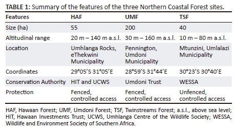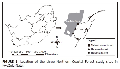 Northern Coastal Forest is found embedded in the IOCB biome that extends from the Eastern Cape northwards into KZN (Mucina & Rutherford 2006). In some areas, these forests are restricted to the dunes (Acocks 1988). Beyond South Africa, these forests occur throughout the Mozambican coastline as far as southern Tanzania. Many tropical elements reach their southern limit in the NCF of South Africa (Mucina et al. 2006). The present study was conducted in three NCF patches along the Indian Ocean coastline (Figure 1). Hawaan Forest (29°05'S, 31°05'E) is located in the Umhlanga Rocks area (northern Durban), while the secondary forest (TSF) (30°23'S, 030°40'E) is situated near the town of Mtunzini, 160 km north of Durban. Umdoni Forest, the southernmost of these forests (28°59'S, 31°44'E), is located between Park Rynie and Ifafa Beach. The largest forest is UMF (200 ha), followed by HAF (55 ha) and TSF (40 ha). The details of all sites are given in Table 1. To justify the comparisons made in this study, it is instructive to consider the successional status and disturbance histories of the three forests in greater detail.