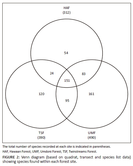 When the quadrat data were considered, the number of species found in the three forests (152-179) was in the range reported for subtropical forests in eastern KZN (e.g. 104 woody species [Gaugris & Van Rooyen 2008]); 195 tree species [Griffiths & Lawes 2006]). However, the number of species was lowest in the primary forest (HAF) and comparably higher in UMF and TSF, despite the latter being a secondary forest. When the quadrat data were supplemented with transect and existing species list data, the total number of species was again lowest in the undisturbed primary forest (HAF; n = 312) and higher in the secondary forest (TSF; n = 390) and disturbed primary forest (UMF; n = 490) (Figure 2). It was expected that UMF would have the highest species richness based on size (200 ha) (MacArthur & Wilson 1967). However, TSF, the smallest forest (40 ha), had far more species than HAF (55 ha) (Table 1). As in other studies (e.g. Pimm et al. 2014), these data suggest that habitat loss and disturbance influence forest species richness (i.e. alpha diversity). Studies on forests in others parts of the world have also shown that certain disturbances can lead to an increase in forest alpha diversity (Hobbs et al. 2006; Macdonald et al. 1989).