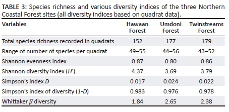 The Shannon's evenness index was comparable across the three forests irrespective of disturbance history. A threshold value of 2 for the Shannon diversity (H') index is considered as a minimum value, above which an ecosystem may be regarded as having medium to high diversity (Whittaker 1972). Values for this index for all forests studied were higher than 2 and in the range of values reported for other KZN coastal forests (2.3-3.6 [Olivier & Van Aarde 2014]). Interestingly, values for this index were highest for the primary forest (4.37), followed by the secondary forest (3.79) and disturbed primary forest (3.69). Values for the Simpson's index of diversity index (1-D) obtained here were slightly higher than that reported for KZN coastal forests (0.58-0.88 [Olivier & Van Aarde 2014]). Unlike species richness, diversity indices take into account species abundance as well. Despite this, the patterns observed for diversity appear to contradict those observed for species richness generated for each forest via the compilation of quadrat, transect and species lists, which showed species richness to be the greatest in the secondary forest and lowest in the primary forest (Figure 2). A comparison of the quadrat data exclusively also showed species richness to be the lowest at HAF (n = 152) and higher at both UMF (n = 177) and TSF (n = 179) (Table 3).