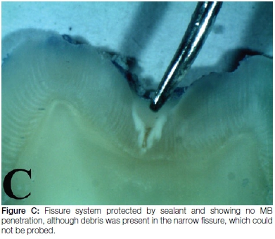 The group of teeth that had received FS protection demonstrated that MB penetration into all the fissure systems had been prevented. It became clear that fissure systems, although decalcified and even with an area of debris at the base of the narrow fissure, received adequate protection with FS application against the penetration of the MB solution during thermocycling (Figure C).