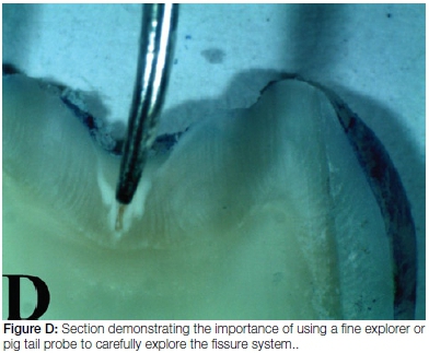 Fissure visualisation is essential and therefore a very fine explorer probe (FT10 probe) or pigtail probe should be used during the assessment of the fissure system to enhance the diagnostic skills of the clinician and to assist in the decision to place FS (Figure D).
