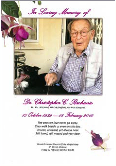 Dentistry lost an icon when Chris Rachanis passed away. Being dual qualified in Medicine and Dentistry, Chris was able to bring clear perspectives to Oral Medicine, as will readily testify the literally hundreds of Wits graduates who sat at his feet absorbing insights into his cherished field.