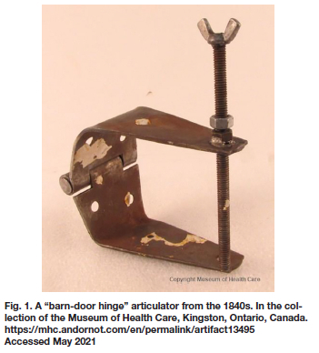 In the beginning there was the so-called "plaster articulator" which wasn't an articulator at all, but merely a means of seating the models in a consistent position relative to each other. There was no movement. Then there was the "barn door hinge", which provided a simple hinge movement (Fig. 1).