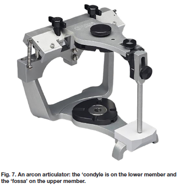 First, though, a look at two generic articulator types, the 'arcon' and 'non-arcon' because these terms have been known to be confusing to some. The term, 'arcon' dates back to 1950 and is merely a contraction of the words articulator and condyle and was used to distinguish articulators which had the 'condyle' on the lower part and the 'fossa' on the upper part of the device. This was because many of the earlier articulators (which by the way, you can still buy today) had these parts the other way round and are now known as 'non-arcon'. An example is the Dentatus articulator (Fig. 6), and an arcon articulator, the Denar Mark II is shown in Fig. 7.