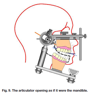 Fig. 9. Shows the articulator opening as if it were the mandible. In reality, the lower member remains flat on the bench and the upper member is opened, something that often confuses those using an articulator for the first time.