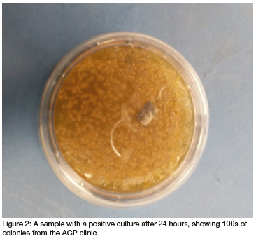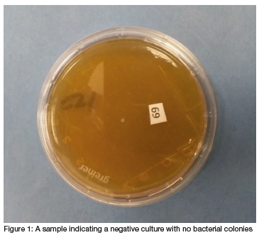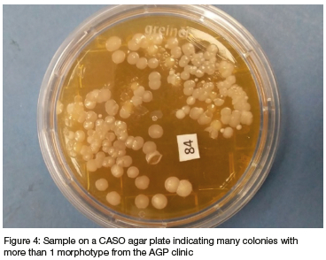 After careful transfer and storage of swabs, these were vortexed and cultured on media incubated at 370C under aerobic conditions. The swabs were cultured on to fresh CASO agar plates to observe positive bacterial growth. The laboratory technician (EM) completed this phase as a blinded procedure as all swabs were coded using numbers for students and letters for staff. Only the primary reseacher (SK) knew which swab belonged to whom. Twenty five samples turned positive for bacterial cultures within 24 hours of incubation: From the AG groups, 16 students and 2 staff members' and from the non-AG groups, only 4 students and 3 staff members'mobile phone swabs yielded positive bacterial cultures, but each looked very different. This could be due to the AG clinic staff being more conscious of cleansing protocols. An example of a negative and positive bacterial culture from mobile phone swabs is shown in Figure 1 and 2 respectively.