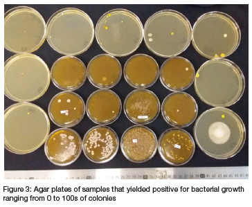 The staining procedures of the previous phase assisted to determine whether the colony forming units were Gram-positive or negative and to discern their morphologies, that is, in identifying bacteria according to morphology and extracellular and intracellular structures, taking it closer to definitive identification of bacteria in the colonies observed (Figure 8). The descriptions of the intracellular structures obtained from Gram staining viewed under a light microscope indicated that the Gram-positive cocci form chains whereas the Gram-negative appeared like rods and bacilli distinguishing it from the former. Gram-positive yeast-like microorganisms were also observed (Figure 8).