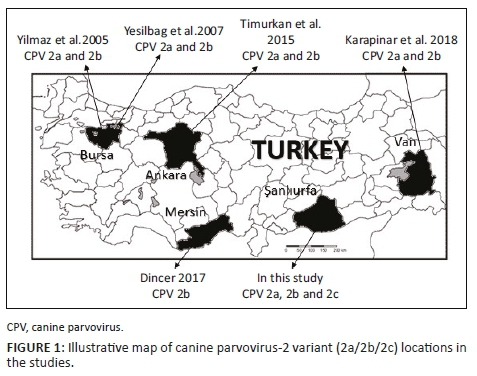 There have been few molecular characterisation studies of CPV-2 variants in Turkey (Table 1 and Figure 1). Some studies have reported that CPV-2a/2b is present in dogs (Karapınar, Dincer & Ozkan 2018; Timurkan & Oguzoğlu 2015; Yesilbag et al. 2007; Yılmaz, Pratelli & Torun 2005), while CPV-2c has been detected in the blood samples of cat collected from Ankara Province (Muz et al. 2012). However, there are no reports yet of CPV-2c in Turkey's dog population.