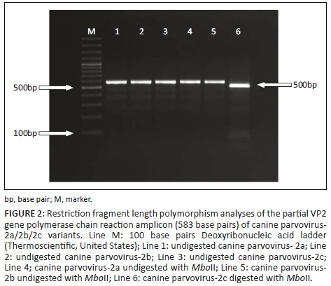 For RFLP analysis, viral genomic DNA was amplified using 555for-5'-(CAGGAAGATATCCAGAAGGA)-3' (from 4003 to 4022)/555rev-5'-(GGTGCTAGTTGATATGTAATAAACA)-3' (from 4585 to 4561) primers to obtain the partial VP2 gene, region (583nt) (Buonavoglia et al. 2001). The amplified PCR amplicons were then digested using the enzyme MboII (FastDigest, Thermo Fisher Scientific, US) for RFLP characterisation, which distinguished CPV-2a/2b variants from CPV-2c (Buonavoglia et al. 2001). The 583-bp PCR amplicons were digested with 2 µL (5U/1 µL) of the restriction enzyme MboII, 1 µL of 10x MboII buffer and 8 µL of molecular grade water for 1 hour at 37 °C on a heat block. Subsequently, digested and non-digested amplicons were assessed on 1.5% agarose gel electrophoresis stained with ethidium bromide (Figure 2).