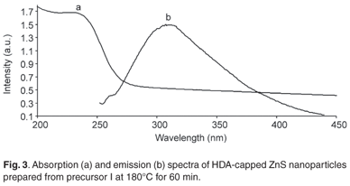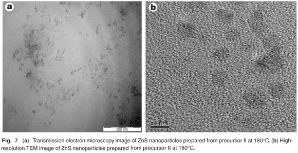 In a typical experiment, [ZnCl2(SC(NHC6H11)2] (precursor I) (1 g) was dissolved in TOP (1015 ml). This solution was then injected into 6.25 g of hot HDA at a temperature of 180°C. A subsequent decrease in temperature of 2030°C was observed. The solution was allowed to stabilise at 180°C and heated for a further 60 min. The solution was then allowed to cool to about 70°C, and methanol was added to remove the excess HDA. The as-synthesised flocculent precipitate was separated by centrifugation and redispersed in toluene. The solvent was then removed by evaporation under reduced pressure to give HDA-capped ZnS nanoparticles. The particles were washed three times with methanol and redispersed in toluene. This same procedure was followed using precursor II, ZnCl2(CS(NHC3H7)2)2 to prepare HDA-capped ZnS nanoparticles.