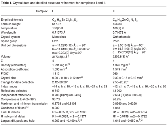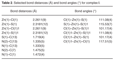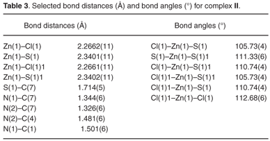 [ZnCl2(CS(NHC3H7)2)2] (II). A hot solution of N,N'-diisopropylthiourea (1 g, 6.25 mmol) in ethanol (20 ml) was added to a heated solution of zinc chloride (0.43 g, 3.13 mmol) in ethanol (25 ml). The mixture was stirred and refluxed for 1 h. The colourless solution was filtered hot to remove any traces of unreacted materials and was left in an open beaker at room temperature. A colourless needle-like crystalline product was obtained after 24 h. The product was filtered, washed twice with ethanol and dried under vacuum. Yield 62.7%; m.p. 192.1193.8°C. C14H32N4S2Zn: Anal. Calcd. C, 36.81; H, 7.01; N, 12.27; S, 14.02. Found: C, 36.69; H, 7.06; N, 12.22; S, 13.73. IR (nujol mull)/cm1: 3271(vs), 2978(s), 1558(vs), 1450(s), 1388(sh), 1280(s), 1141(s), 956(m), 848(w). 1H NMR (δ, CdCl3) ppm: 2.15 (d, 2H, C3H7); 1.60 (s, 6H, C3H7), 7.22 (s, 2H, NH). 13C {1H} NMR (δ, CdCl3) ppm: 179.38 (s, CS); 31.22 (s, CH3).