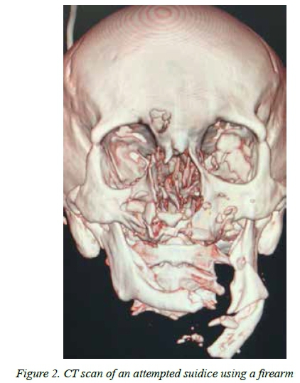 Self-harm related injuries place a significant burden on all departments in the hospital. They often require imaging and not infrequently require surgical treatment. The most common operations are laparotomies and neck explorations. Occasionally significant injuries require complex surgical reconstruction involving a number of sub-specialties. The man with the laceration to his neck (Figure 1) required complex reconstruction and a tracheostomy whilst the patient with the gunshot wound to his face (Figure 2) required complex plastic and maxillofacial surgery.