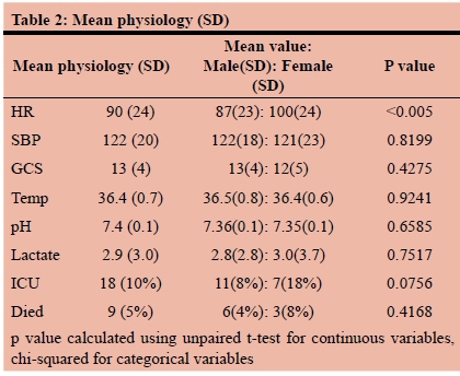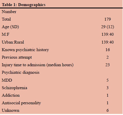 During the five-year study period, a total of 179 patients sustained self-harm and were managed by the PMTS. The mean age was 29 years (SD12) and there were 139 (77%) males and 40 (23%) females. Of these, 16 had a previously established psychiatric diagnosis and two had prior histories of having sustained self-harm. The previously diagnosed psychiatric illnesses included MDD (5), schizophrenia (3), substance abuse and dependency (1), anti-social personality disorder (1) and unspecified (6). In the patients who attempted to hang themselves, 60.9% had consumed alcohol just prior to the incident. There were 139 patients from the city of Pietermaritzburg and 40 from the rural areas of western KZN. Table 1 summarizes the demographics of the cohort. Table 2 summarizes the presenting physiology of the patient cohort.