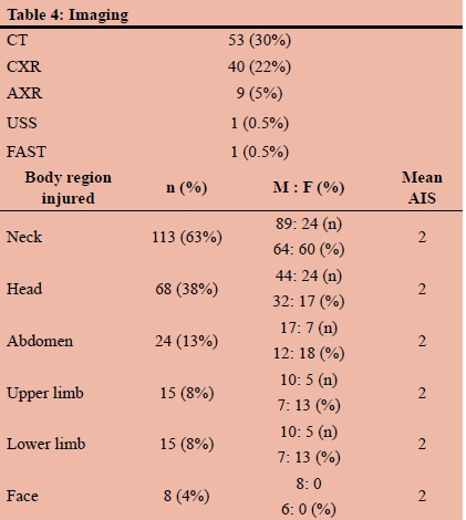 RESULTS: During the five-year study period, a total of 179 patients were included. The mean age was 29 years (SD12) and there were 139 (77%) males and 40 (23%) females. Of these, 16 had a previously established psychiatric diagnosis and two had a prior history of having sustained self-harm. The previously diagnosed psychiatric illnesses included mood dysphoria disorders (5), schizophrenia (3), substance abuse and dependency (1), anti-social personality disorder (1) and unspecified (6). The mechanism was penetrating trauma in 47 (26%). The penetrating mechanisms included stab wounds (SW) in 33, gunshot wounds (GSW) in 10, broken glass in 2 and a single impalement. Blunt mechanisms accounted for the remaining 131 (73%) injuries. The most common mechanism of blunt self-harm was hanging in 101 patients. This was followed by vehicular related trauma (8), jumping in front of a train (1) and jumping from a height (1). In 17 patients the exact mechanism of the blunt trauma was unclear. There was no statistical difference in the mechanism of injury between male and female patients. There were 38 (28%) men and 9 (23%) women who sustained a penetrating injury and there were 100 (72%) male and 31 (78%) female patients who had a blunt mechanism of injury. A total of 53 CT scans were obtained, 40 chest X-rays, 9 abdominal X-rays and 2 ultrasounds. There were 113 neck injuries, 68 head injuries, 24 abdominal injuries, 15 upper limb and 15 lower limb injuries and four facial injuries. A total of 32 operations were performed. These included laparotomy (14), neck exploration (5), tracheostomy (4). A total of 22 patients developed a complication