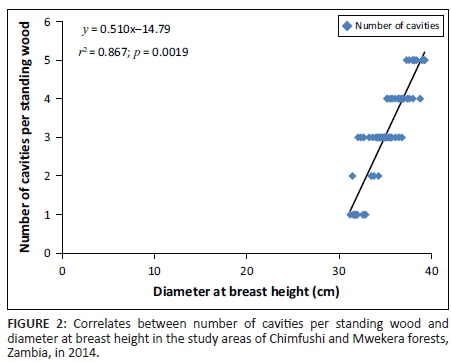 In this study, undisturbed forests found in the Chimfushi area supported a more diverse array of cavity-nesting birds than human-dominated forests in Mwekera. In both forest types, environmental conditions were similar except for the direct anthropogenic factors such as uncontrolled firewood collection, logging, wild fires, and land clearing for agriculture purposes that occurred in the Mwekera forests. The aforementioned anthropogenic factors could have been responsible for the occurrence of much less abundance and diversity of cavity-nesting birds in the Mwekera forests than the Chimfushi forests. According to Trzcinski, Fahrig and Merriam (1999) and Roberts (2007), environmental factors such as deforestation and habitat fragmentation might trigger the presence or absence of certain cavity-nesting birds in a particular area. Based on studies conducted elsewhere, it would also appear that undisturbed forests contain more cavity-nesting birds than disturbed forests, due in part to increased availability of nesting sites (dos Anjos 2006; Reid et al. 2014). Some bird species in the study areas might have been affected by direct persecution by humans and other predators. For instance, owls are persecuted by local communities based on superstitions surrounding them (Lee & Irwin 2005), despite owls being natural biological control agents of pests such as rodents and insects in agrarian and semi-urban landscapes (Meyer 2008).