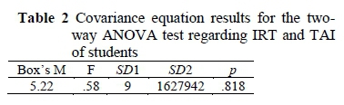 According to the same table, IRT and TAI become significantly different (Wilks' λ = .92; F = 6.19; p < .000; η2= 0.042). This result means that the change in SS has an average effect on both of the dependent variables. On the other hand, it is determined that the interaction between classes and SS score does not cause a significant difference on the dependent variables (p > .05).