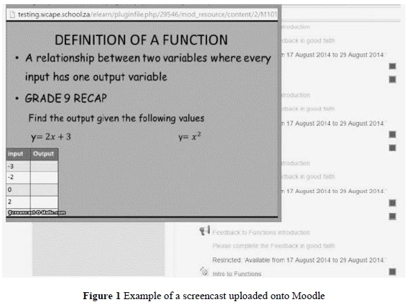The Upper Level of the SCenTRLE framework is the highest level where learners engage in self-study using online resources (Hirumi, 2002). In this study the teacher produced and uploaded screencast on functions onto the Moodle platform. Screencasting is a digital recording of a computer screen that enables the teacher to explain a process on the computer while recording it into a narrative video. The screencast video was then uploaded onto the Moodle platform for learners to access and study.