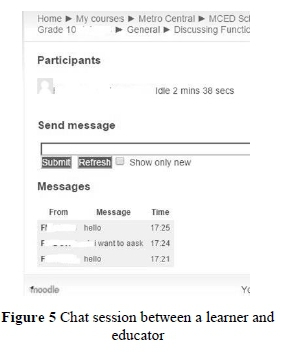 Figure 4 shows the first two weeks of the messenger intervention. Class Green used Moodle messenger to seek clarification for conceptual understanding of functions from the teacher and peers. The first week showed high messaging rates; possibly, because learners had initial challenges using Moodle LMS, or perhaps they had more questions to ask regarding the concept of functions. It was significant that the most interaction took place on a Sunday. Learners used the chat tool mostly on content related issues, although occasionally they used it for social communication. This tool was useful for learners with communication barriers in normal lessons. They presented their problems via the chats, ensuring that the learning process did not break down. The chat platform was important since there was no need to wait for the next lesson to understand a concept or to give other learners hints. Figure 5 below shows an extract of a chat section between a learner and the teacher. Studies of online messengers' synchronous interaction indicate that it empirically reduces transactional distance (Benson & Samarawickrema, 2009; Burgess, 2006; Moore, 1993). This reduction implies that the increased interaction can help learners learn concepts better, i.e. more thoroughly, quickly and in a sustained manner.