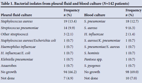 The culture-positive rates of pleural fluid and blood culture were 45/142 (31.7%) and 33/132 (25.0%), respectively (Table 1). The commonest bacterial pathogens identified on blood or pleural culture were S. aureus and S. pneumoniae (Table 1). Ninety and 104 patients, respectively, had gastric lavage and pleural fluid investigated for TB. Overall, 12/142 (8.4%) children had culture-confirmed TB, of whom 10/104 (9.6%) were diagnosed with TB empyema. Two additional cases of culture-confirmed TB were detected through gastric lavage cultures. Bacterial-TB empyema was confirmed by culture in 5 patients.