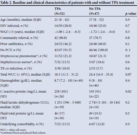 METHODS: We did a prospective observational study of children sequentially hospitalised with empyema between December 2006 and December 2011 in South Africa (SA). Intrapleural tissue plasminogen activator (TPA), administered according to a standard protocol, was introduced in September 2009. Outcomes in children treated with TPA after 2009 were compared with the historical cohort not treated with TPA who met the treatment criteria.