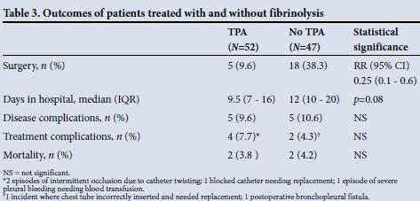 RESULTS: One hundred and forty-two children with empyema, median age 17 months (interquartile range 8 - 43), were admitted during the study period. Excluding children who did not have a chest tube inserted and those in whom fibrinolysis was contraindicated, there were 99 patients, 52 of whom received fibrinolytics. Clinical characteristics and empyema aetiology were similar in those who received fibrinolysis and those who did not. Eighteen children (38.3%) not treated with TPA required surgery v. 5 (9.6%) treated with TPA (relative risk 0.25; 95% confidence interval 0.1 - 0.6). The median duration of hospitalisation was similar in both groups. Complications occurred rarely and with a similar incidence in both groups. In-hospital mortality was low, with two deaths in each group.
