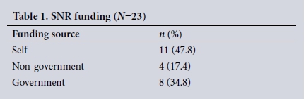 Sources of SNR funding (Table 1) (response rate 74.2%). Of the SNRs, 47.8% were self-funded, 17.4% (4/23) were funded through private organisations (e.g. non-governmental organisations), and 34.8% were funded by their own governments.