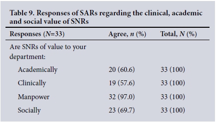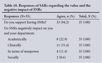 Clinical and academic value of SNRs (Tables 9 and 10). The responses of SARs regarding the value of SNRs in terms of academic contribution and providing a clinical service, and their value socially, were generally favourable (Table 9). Ninety-four percent of SARs supported having SNRs (Table 9), and the perceived negative impact of SNRs applied mainly to clinical and academic practice (Table 10).