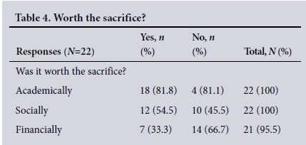 Is SNR training worthwhile? (Table 4) (response rate 71.0%). The sacrifices that were required to obtain a specialist qualification were deemed to be worthwhile from academic (81.8%) and social (54.5%) perspectives, but not from a financial perspective (33.3%).