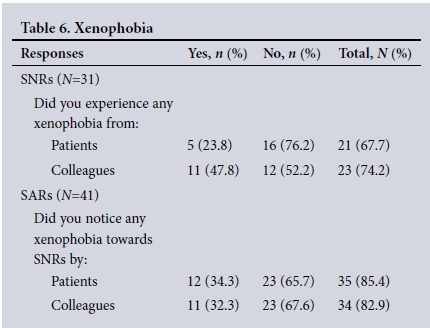 Xenophobia (Table 6). The perception of SNRs that they were subject to xenophobia from patients (23.8%) and colleagues (47.8%) is supported by similar observations reported by a third of SARs.
