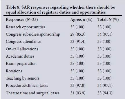 Registrar duties and opportunities (Tables 7 and 8). From the data in Table 7, it is apparent that SNRs felt disadvantaged in relation to the allocation of learning opportunities, academic support and on-call allocations. Their sense of being disadvantaged was very different from the perception of their SA colleagues, who believed that SNRs were being treated equally. Surprisingly, some SARs believed that SNRs should not enjoy the same learning and academic support, despite their being fee-paying students (Table 8).