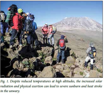 Prickly heat or miliaria rubra is infrequently seen in the South African (SA) context, but occurs in humid or tropical climates owing to exocrine sweat duct blockage during copious or prolonged sweating. It presents as an erythematous pruritic rash with papules, usually on the neck, trunk and limbs, but sparing hands and feet. While heat rash alone is more of an irritation than a serious illness, the reduction in sweat production by duct obstruction can greatly reduce efficiency of evaporative heat loss and predispose the sufferer to more severe injuries. Sunburn - epidermal and dermal damage due to exposure to ultraviolet radiation - also limits sweat production. In its severe form, it can result in a systemic inflammatory response manifesting with headache, nausea, fever or rigors, and delirium.