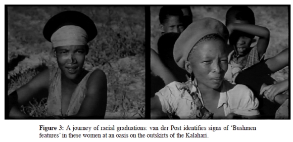A striking element of this process of journeying out of time is van der Post's insistent emphasis on 'purity' in the Bushmen he seeks. The expedition could also be termed a journey of racial graduations. The people he meets are categorised according to their racial features, in a bid to show how unique and different 'true' Bushmen are compared to all other black and brown people in the region. Thus, people whom the expedition encounters are inspected on camera for physical characteristics that might denote Bushmen ancestry, such as 'high cheek bones' or 'apricot coloured skin'.