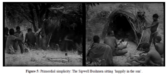 In keeping with this idealisation of the 'past in the present', the world of the 'true' Bushmen is described by van der Post as 'lovely and natural'. As the Sipwell Bushmen (as van der Post names them) go about their daily chores, the camera rolls and van der Post again emphasises that amongst these Bushmen, 'no one seems to have heard of time'. Rather, the Bushmen work and sit about 'happily in the sun as they had sat for centuries'. Hunting and dancing are idealised. This would become something of a tradition in later documentary films on the Bush-men.33 In Lost World both are attributed not to culture or even the need to survive, but to the essential nature of the Bushmen. Van der Post actually states in the voiceover narrative that 'true Bushmen are essentially hunters.'