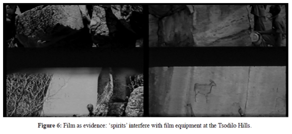 By petitioning these spirits for absolution for breaking the sacred law of the Hills, van der Post demonstrates a willingness to engage earnestly with the spiritual beliefs of the Bushmen whom he is seeking. In this way, he casts himself as the connective thread between Aboriginal Africans (Bushmen) and the West, between primitivism and technology, between spirituality and reason. The power of the film camera here should not be underestimated. By breaking down, the film camera is shown to be susceptible to the mystical power of the spirits of the Tsodilo Hills. Furthermore, the inclusion of the half-frames and jammed frames in the broadcast television series signifies that the evidence of this susceptibility is in the mechanism of the film itself. In this instance van der Post relies on the damaged frames to 'prove' the entire episode which is followed, as has been shown, by the expedition's shift to 'a new dimension of living'. For van der Post the filmmaking process was a useful means of showing his audience exactly what he was talking about: a mechanism not available to the writer of fiction, as will be discussed below.