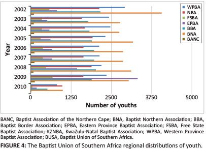 Statistics South Africa in their 'Mid-year population estimates' report (2011:12) indicate that nearly one-third (32.3%) of the South African population is younger than 15 years; approximately 7.7% (3.9 million) is 60 years or older. Additionally, of the 32.3% under the age of 15, 3.6 million (23%) live in KwaZulu-Natal and 3.07 million (19.4%) live in Gauteng. Additionally, the Northern Cape, the province with the smallest population, has nearly onethird (30%) of its population aged younger than 15 years (cf. Statistics South Africa 2011:12). Figure 3 indicates a general growing trend in children's ministry from 20032010, which is confirmed by Christofides (2009:186) in his study on the numbers of Sunday school children in BUSA since 1993. However, 2011 depicts a tragic departure from this trend, as is evident within all spheres of ministry to the 'next-generation' in BUSA.