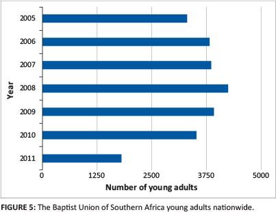 Despite the focus of BUSA's vision 2010 to double local church membership, double Baptist Union (BU) member churches, double the number of children and youth being reached, 300 churches with youth and young adult ministries, doubling the number of children's workers and teachers, 300 churches being 'mission involved', it seems that the exact opposite has been the net result. A similar trend regarding children and youth can be found within the young adult segment of BUSA. The only difference between children, youth and young adults is that the downward spiral in membership and participation for young adults started nationally from around 2008 (cf. Figure 5). This trend specifically is of great significance as it shows an evident weakness of BUSA churches to engage a generation of South Africans meaningfully with the gospel, disciple them adequately in the faith and deploy them responsibly in the mission of the church as it follows the mission Dei in its teleological orientation.
