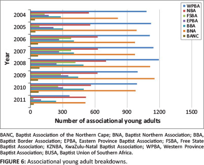 Figure 6 (below) depicts the 'associational' breakdown of young adults nationwide. The Western Province Baptist Association (WPBA) has experienced the greatest decline in young adult membership and participation since 2004, alongside the BNA and BBA. The only region to maintain a reasonable young adult segment in churches is the Natal Baptist Association (NBA), which incidentally, according the Statistics South Africa's (2011:14) mid-year report, has the greatest population of young adults in South Africa (aged 20-24), and the second largest population of young adults in South Africa (aged 25-29) by a small margin compared to Gauteng. The same report records KwaZulu-Natal as having the lowest number of people migrating outward (-10 174) in the years 2001-2006. In the period between 2006-2011 this trend changes somewhat with KwaZulu-Natal currently being the third largest region in terms of in-migration figures in South Africa (Statistics South Africa 2011:13). Thus, despite the NBA's steady growth in the young adult segment, it is not nearly as significant as the overall growth trend within the NBA region.