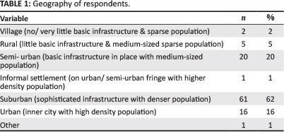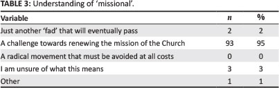One of the immediate questions that come to mind relates to whether the research into missional ecclesiology within BUSA is limited to a specific group of individuals within BUSA with a certain 'agenda' (e.g. Isaiah 58 network, Sola 5 etc.). However, the missional church survey covered a wide field of respondents from within numerous geographical, cultural and ideological or theological settings. From the geographical perspective, respondents came from varied settings within South Africa, that in many respects reflect our own population trends, with the bulk of the populace centred within urban contexts. The values in Table 1 indicate the broadness in terms of inclusivity within the scope of this study. The only section that did not receive much response is from those ministering in informal settlements. The reason this is lower, is that many respondents would classify their informal settlements within the context of 'semi-urban' in the South African setting. However, there are not a large number of BUSA churches engaged in ministry in informal settlements (as a proportion to the whole).