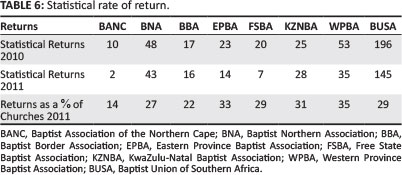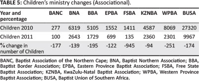 The 2011-2012 SABH Handbook (2012:115) reports of the associational change in children's ministry figures between 2010 and 2011 (cf. Table 5).
