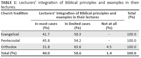 On the issue of how lecturers integrate Biblical principles into their lectures, about 40.0% of the respondents indicated that lecturers in most cases do integrate Biblical principles into their lectures, while 58.6% were of the view that lecturers do so in limited cases. Moreover, about 50.0% of the respondents revealed that lecturers do present themselves as Christians to a high extent.