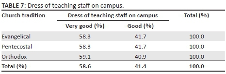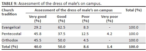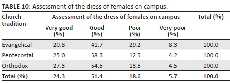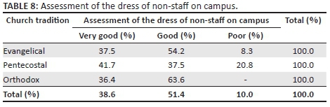 Our study has revealed that all the universities being used for this research have prescribed a form of dress they deemed to be appropriate for their students in their students' handbooks. However, these dress codes are not seriously enforced by the authorities of the institutions. Tables 6-10 are a representation of how respondents assessed the dressing of students and staff of the universities used for the study. The tables indicate that the dress code on the selected university campuses is progressively good at various angles. However, the Pentecostals are doing better than the other two faith traditions. About 41.7% of the respondents are of the view that the dress code of the staff is very good, and 45.8% and 25.0% of the respondents also share a similar view on the dress code of both males and females (Tables 9-10).
