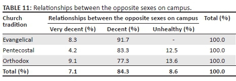 As part of our objective to ascertain the realities going on at the various campuses, we found it necessary to also consider the issue of opposite sex relationships, discipline and how these issues are enforced on various campuses. Although reports regarding issues related to rape and sexual harassment in Christian universities in Ghana are minimal, the data from our study has emphasised this fact. About 84.3% of the respondents indicated that opposite sex relationships on various campuses are decent (Table 11).