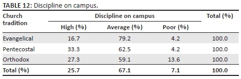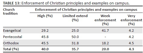 It is the expectation of leaders of Christian universities that staff and student conduct be grounded in Biblical principles. Each member of the university is expected to uphold these values through integrity, honesty, trust, fairness and respect toward peers and the community. However, as a community of Christian scholars, the university expects from its staff and students a higher standard of conduct. About 67.1% of the respondents were of the view that discipline on various campuses is average. An assessment of how Christian principles and examples on campus are enforced demonstrates that Christian principles are averagely enforced. About 40.0% of the respondents indicated it to be highly enforced while 35.7% were of the view that Christian principles are enforced to a limited extent (Tables 12 and Table 13). As far as discipline and enforcing Christian principles are concerned, the Pentecostals are doing well. About 33.3% and 45.8% of the respondents from the Pentecostals, respectively, indicated that both issues are being implemented at a high level. It is however interesting to note that the Orthodox are almost parallel to the Pentecostals on the enforcement of Biblical principles and examples on the campuses (Table 13).