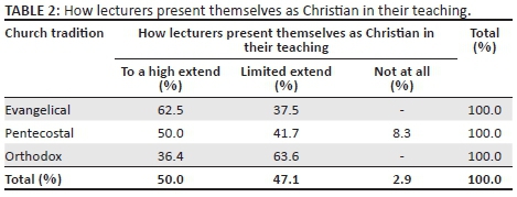 In spite of the fact that the university colleges being discussed have introduced programmes that will help integrate Christian principles and virtues into the lives of their students, this is not enough. One must also think of the lifestyle and spiritual maturity of the facilitators of these programmes as well as that of the staff of the institution. About 40.0% of the respondents indicate that lecturers in most cases do integrate Biblical principles into their lectures, while 58.6% were of the view that lecturers do so in limited cases. A further study to ascertain how lecturers present themselves in their teaching or lecture halls, 50.0% and 47.1% of the respondents revealed that lecturers do present themselves as Christians to a high and limited extent, respectively (Tables 1 and 2). In Table 2, 62.5% of the respondents indicated that the Evangelical lecturers present themselves as Christians to a large extent, followed by the Pentecostals (50.0%) and the Orthodox (36.4%).