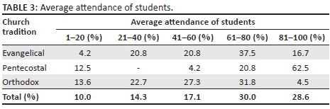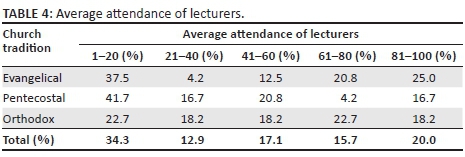 Our field data indicated that the University Colleges used for study do organise regular weekly church services for the university community. However, 30.0% of the respondents indicated that student attendance is always between 61.0% and 80.0% of the entire student population. The same applies to lecturers and other staff. A cross tabulation of the various church traditions as far as participation in campus church services are concerned shows that the statistics of the evangelicals (37.5% - students, 20.8% - lecturers and 29.2% - other staff) is somehow encouraging compared to the other church traditions (Tables 3-5).