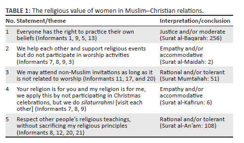 Based on interviews and discussions with informants, researchers conducted coding and interpretation to obtain conclusions about values and religion applied by women in interacting with adherents of other religions. The religious values used by Muslim women to strengthen Muslim-Christian relations are presented in Table 1.